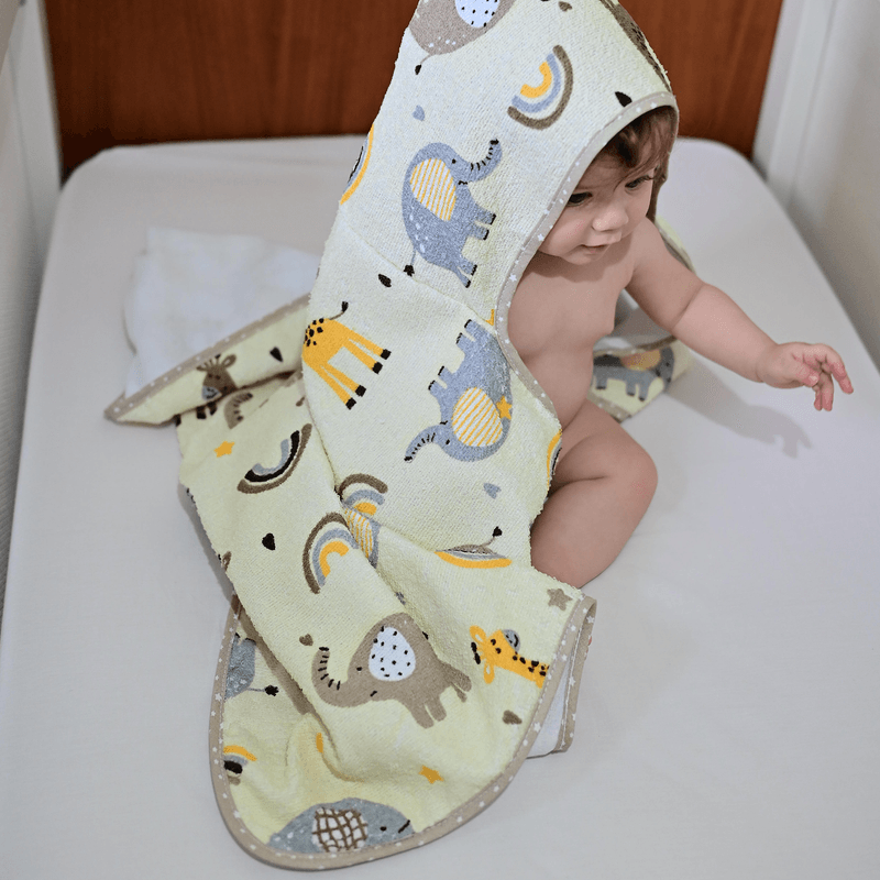 A toalha de banho para bebê é um item indispensável no enxoval do seu pequeno. Feita com tecido macio e absorvente, proporciona uma secagem suave e rápida após o banho, mantendo a pele delicada do bebê protegida e livre de irritações.
